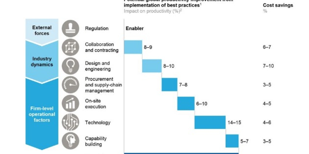 In the built environment sector, the government’s push of building information modelling (BIM) has also been a significant factor in promoting digital transformation since 2009. But it would be wrong to think the industry simply needs to invest in new technologies. (As the diagram – from McKinsey – below suggests, technology is just one of seven areas where construction needs to catch up.)